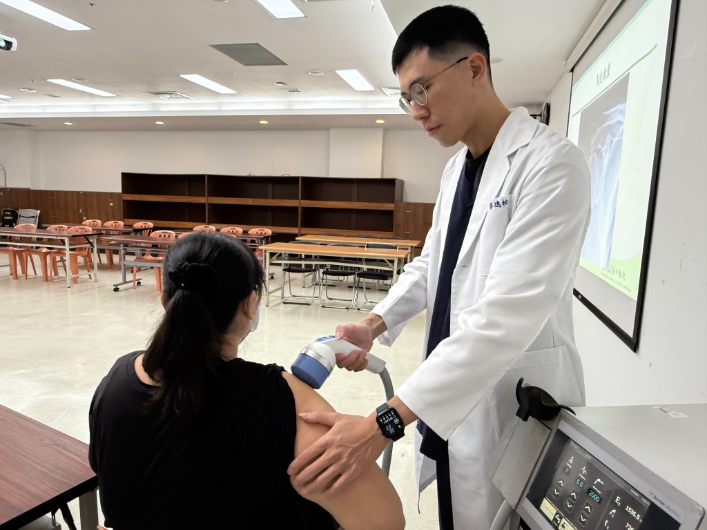 患者透過藥物、熱療與電療,加上體外震波治療(如圖)三週後,症狀明顯改善。