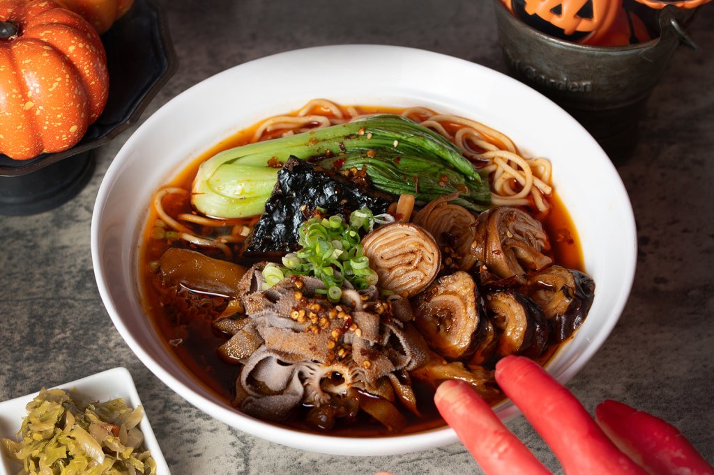 台北中山九昱希爾頓逸林酒店以西洋「萬聖節」為發想,推出新品「開膛破肚牛雜麵」。(圖/台北中山九昱希爾頓逸林酒店提供)