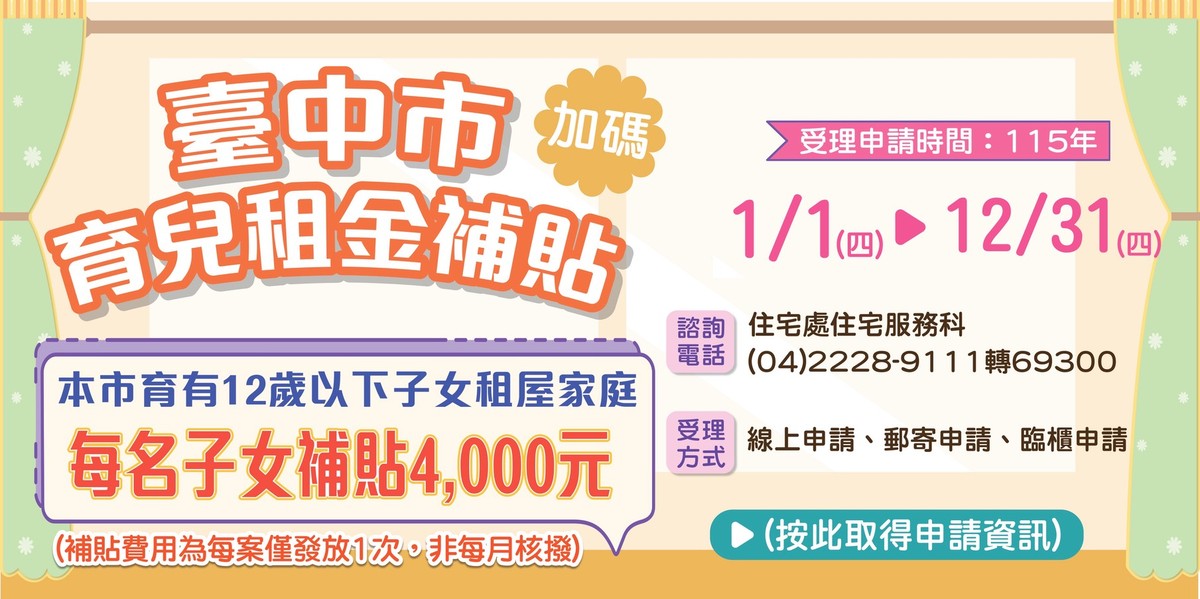 為減輕台中市育有0至12歲子女的租屋家庭負擔,台中市政府運用囤房稅稅收辦理「台中市育兒租金補貼」,自明年1月1日起至12月31日受理申請。台中市住宅發展工程處表示,凡在台中市租屋且符合財稅規定的市民,每名0至12歲子女可獲新台幣4,000元補助,且補助子女數不設上限,即便承租社會住宅的市民亦可申請,全面照顧台中市育兒家庭,補貼戶數上限約為1萬6,240戶,額滿截止。
