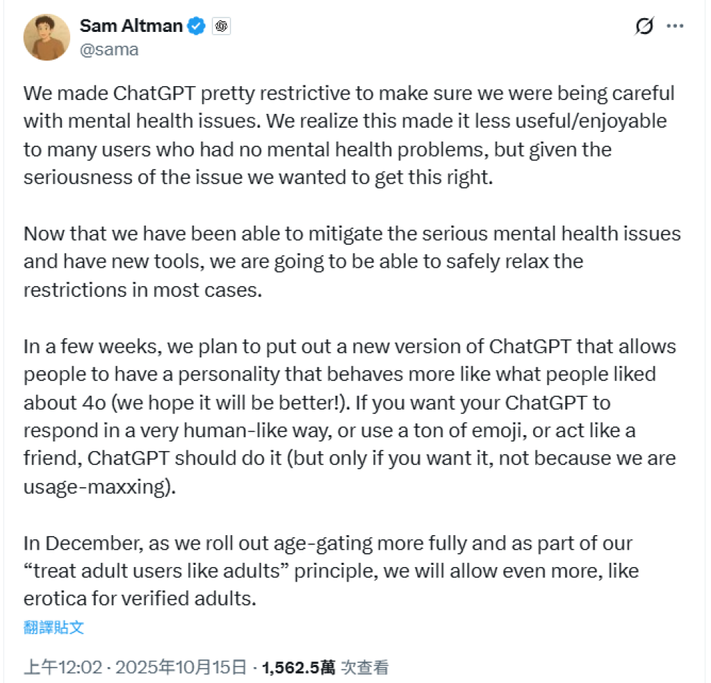 根據外媒報導,阿特曼 14 日在社群平台 X(前 Twitter)上發文,說明 ChatGPT 的未來方針,表示「我們預計在 12 月開放更多內容,包括成人向內容等。」阿特曼說明,當初讓 ChatGPT 設定得相當嚴格,是為了謹慎應對心理健康相關問題。如今已經能夠緩解這些嚴重的心理健康問題,並擁有新的工具,因此可以在多數情況下安全地放寬限制。到了 12 月,隨著全面導入年齡分級系統,並秉持「把成人使用者當成人對待」的原則,將開放更多內容,例如供已驗證成年使用者觀看的情色內容。