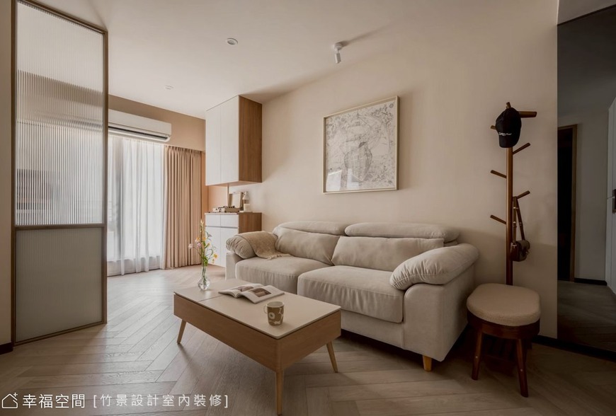 整體空間呈現呈現日式北歐風格,因客廳面寬太窄,拆除一道牆,櫃子改做內坎,營造流暢生活動線,保留客廳與主臥的良好採光,讓屋主能自在享受美好的生活日常 。