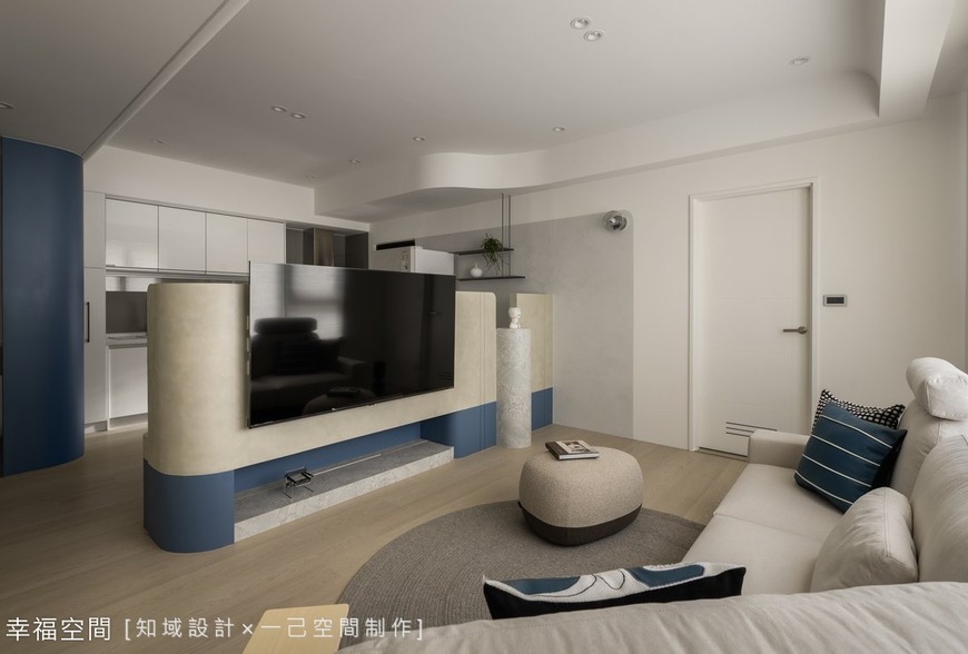 玄關以灰階六角磚為引,襯以霧感石紋與吊燈,界定出輕盈過渡的進門儀式。延伸至客餐廳的木質地坪上,光影游移、層層疊映。白與藍的調和使視覺更顯呼吸感,弧形電視牆柔化軸線,成為空間中的平衡核心。