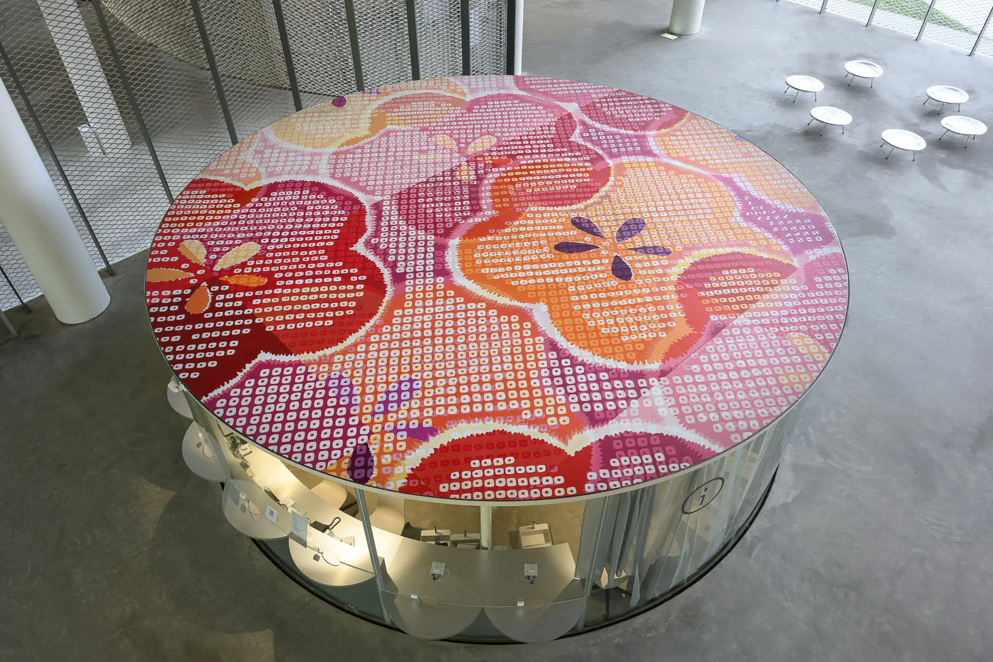 林明弘_(_Michael_Lin_),《再製》,2025,中美館委託製作。攝影:ANPIS_FOTO_王世邦林明弘的《再製》(Processed)則以另一種姿態與建築結構巧妙交織。兩組手繪梅花圖樣佔據入口大廳的兩間玻璃屋屋頂:一組線條精確,另一組錯位重疊,透過如印刷過程中的重疊與錯置手法,將具有時代意義的「臺灣花布」圖騰賦予新意。當觀眾在連通美術館與圖書館的天橋上移動時,可以發現圖樣隨視角轉換而變化,構成一場關於感知、觀看與空間的詩意對話。林明弘認為觀眾的觀看也是作品的一部分,使藝術不再僅是被注視的對象,而是與建築、身體、光影共同生成的經驗。