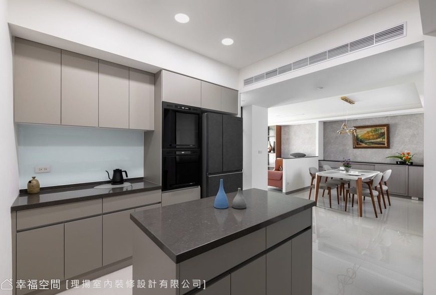餐廚區採開放式規劃,呼應屋主長年旅外的生活習慣。以三大料理平台構成流暢動線,中島兼具大量收納與工作檯機能,可靈活應對烹飪需求;旁側亦完整配置冰箱與烤箱櫃體,使空間機能完備。