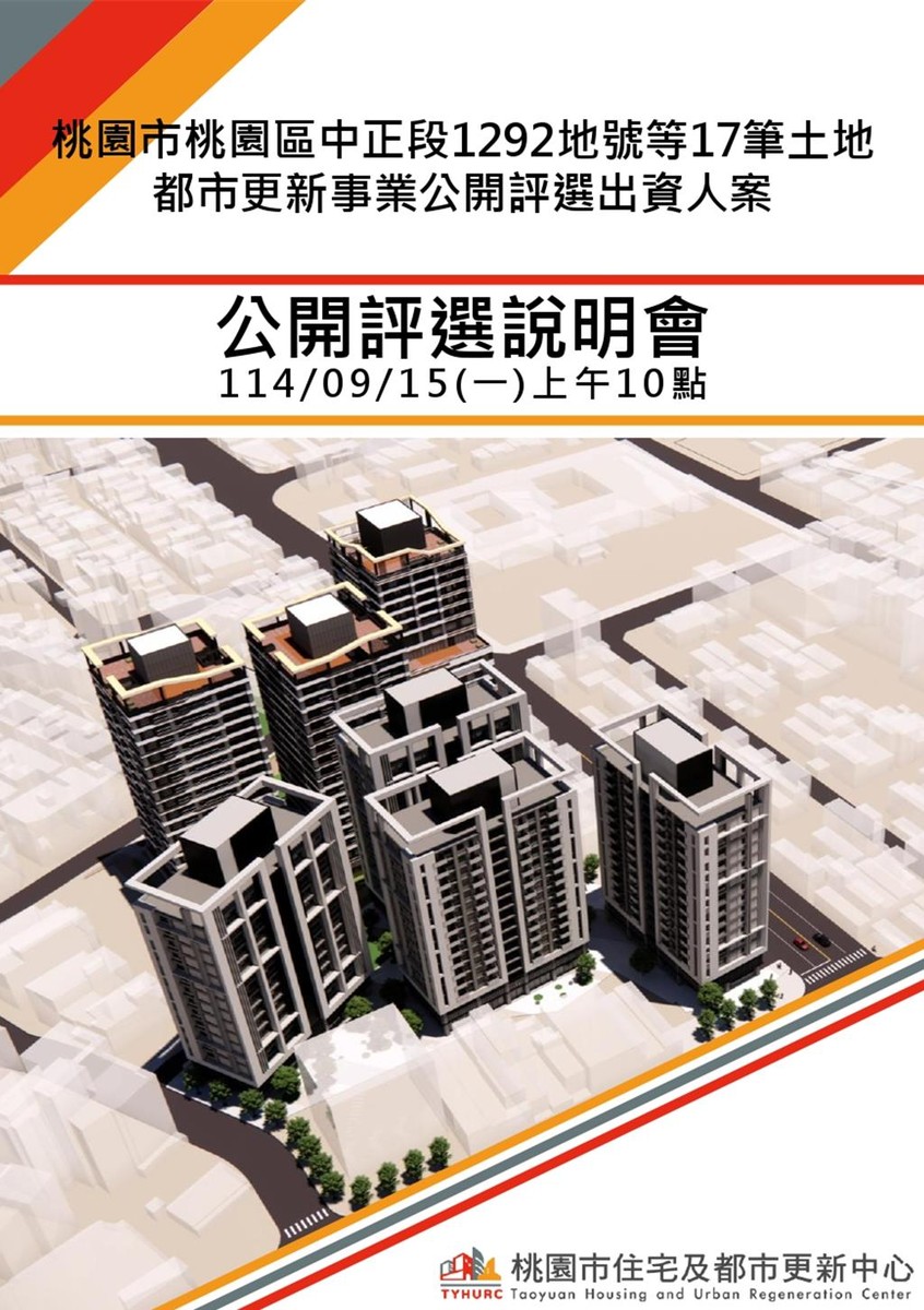 桃園市住都中心擔任實施者,自9月1日起公開徵求出資者,預定於12月8日截標。為了向有興趣的廠商說明基地概況、發展願景、招商資格與條件等重要資訊,特別於9月15日在桃園市政府13樓會議室舉辦公開評選說明會,網路報名至9月12日截止。